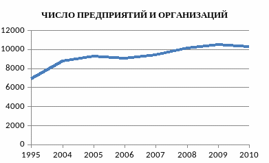 Если рассмотреть количество предприятий, которые существуют на территории Республики Хакасия, то можно сказать, что их количество с 1995 по 2010 годы растет с переменным успехом.