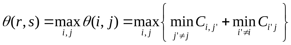 При этом пару городов (r, s) выбирают так, чтобы множество G1 с наибольшей вероятностью содержало оптимальный цикл, а множество G2 - не содержало. Следовательно, пара (r, s) выбирается из множества пар претендентов (i, j), которым соответствуют нулевые элементы матрицы С, т. е. Сij=0, таким образом, чтобы циклам, входящим в подмножество G2, соответствовали как можно более длинные пути. Так как по определению подмножества G2 путь по любому из этих циклов переходит из города r в некоторый промежуточный пункту j(j ≠ s), а в город s коммивояжер приезжает из некоторого пункта i (i ≠ r), длина этого пути будет не меньше чем