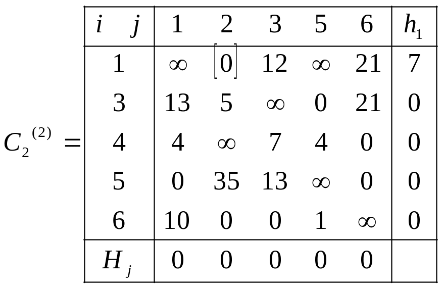 5.4. Построим матрицу С1(5). Для этого вычеркнем шестую строку и третий столбец в матрице С1(4) и, чтобы избежать образования замкнутых подциклов, запретим переезд из города 5 в город 6 (С56 → ∞).