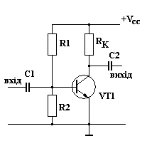 Другий варіант схеми підсилювача напруги приведено на рисунку 2. В схемі фіксується напруга зміщення на p-n переходi емітер-база (тобто напруга на базі транзистора) за допомогою дільника на резисторах R1 та R2.