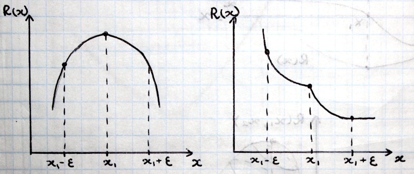1 Способ: исследование значений функции. При этом способе сравниваются значения функции, рассчитанные в точке подозрительной на экстремум и в двух точках, лежащих в ε-окрестности этой точки.
