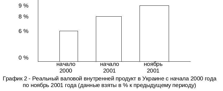 Первый год нового тысячелетия стал шагом на пути к экономическому росту для экономики нашего государства. Это стало возможно благодаря расширению производства и существенного роста продуктивности труда как в отдельных отраслях так и в экономике Украины в целом. С января по декабрь 2000 года валовой внутренний продукт составлял 5,4%, а с января по декабрь 2001 года валовой внутренний продукт Украины увеличился, на 9%. (см. рис.2)
