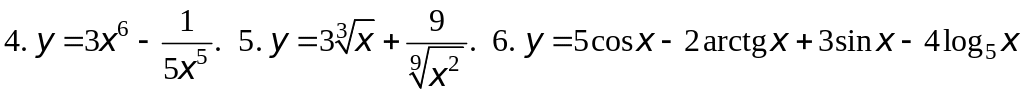 ЗАДАНИЯ. 1,2,3. Найти пределы функций или последовательностей. 4-11. Найти производные от заданных функций, используя таблицу производных и правила дифференцирования. 12-17. Найти , используя правило дифференцирования сложной функции. 18. Найти . 19. Найти . 20. Написать уравнения касательной и нормали к графику функции в точке с абсциссой . 21. Точка движется вдоль координатной прямой . Закон движения точки (зависимость координаты от времени ) задан функцией . Найти положение, скорость и ускорение точки в момент времени . 22, 23. Найти наибольшее и наименьшее значения функции на отрезке . 24-26. Исследовать функцию, построить эскиз ее графика.