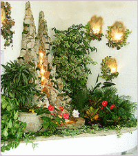 Для декоративного оформления холла, пространства под лестницей можно создать ландшафтную композицию (рисунок 9). Пейзаж может быть лесным или горным, каким вам подскажет ваша фантазия. Композицию создают в контейнере или на специальном гидроизолирующем покрытии. Для декорирования используют камни, коряги, декоративные фонтанчики. Стены грота или старинную кирпичную кладку можно легко сделать из окрашенного пенопласта.