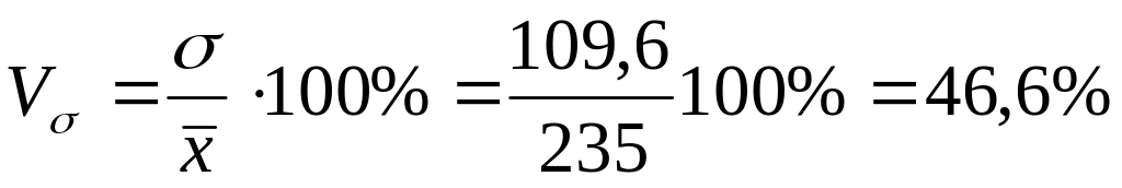Наиболее часто в практических расчетах применяется показатель относительной вариации – коэффициент вариации. С помощью его можно характеризовать совокупность: если коэффициент вариации не превышает 33% (для распределений близких к нормальному, то совокупность считается однородной.