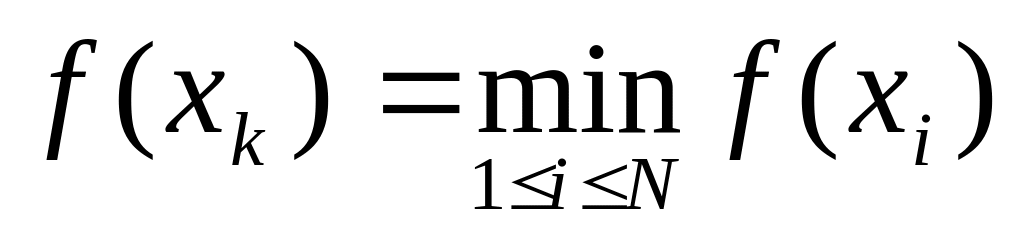Задается интервал унимодальности (начальный интервал неопределенности) L0=a0, b0 и количество вычислений функции N. Функция f(x) называется унимодальной на интервале L0=a0, b0, если она достигает глобального минимума на a0, b0 в единственной точке x* , причем слева от x* эта функция строго убывает, а справа от x* строго возрастает. Вычисления производятся в N равноотстоящих друг от друга точках (при этом интервал L0 делится на N+1 равных интервалов). Путем сравнения величин f(xi), i=1,…,N находится точка xk, в которой значение функции наименьшее. Искомая точка минимума x* считается заключенной в интервале xk-1, xk+1 (рисунок 1).