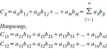Amk*Bkn=Cmn причем каждый элемент сij матрицы Cmn равен сумме произведений элементов i-ой строки матрицы А на соответствующие элемеенты j-го столбца матрицы B , т.е.
