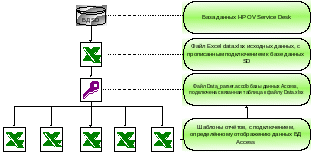 На рис.4 отображен схематичный алгоритм потоков информации, начиная с БД HP OV Service Desk, оканчивая готовыми отчетами Excel.