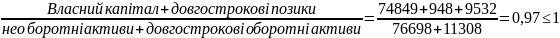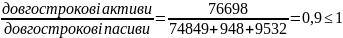 Даний коефіцієнт становить 0,65 грн/грн., тобто є меншим оптимального значення 0,7 грн/грн. Це означає, що довгострокових джерел фінансування недостатньо для фінансування поточної діяльності.
