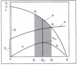 Наосы рекомендуется эксплуатировать только в области кпд. Оптимальный режим работы насоса соответствует подаче Q и напору Н при наивысшем кпд. Однако наивысшее значение кпд соответствует одной подаче Qопт. Эксплуатировать насос на одной подаче не представляется возможным. Поэтому по кривой η – Q выбирается диапазон подач от Q1 до Q2, при которых кпд насоса имеет достаточно высокие значения. На практике допускается снижение кпд на 7-10 % против наивысшего значения для данного насоса. Это диапазон подач называется рабочей зоной насоса, а соответствующие этим подачам напоры Н1 и Н2 ограничивают рабочую часть напорной характеристики насоса.
