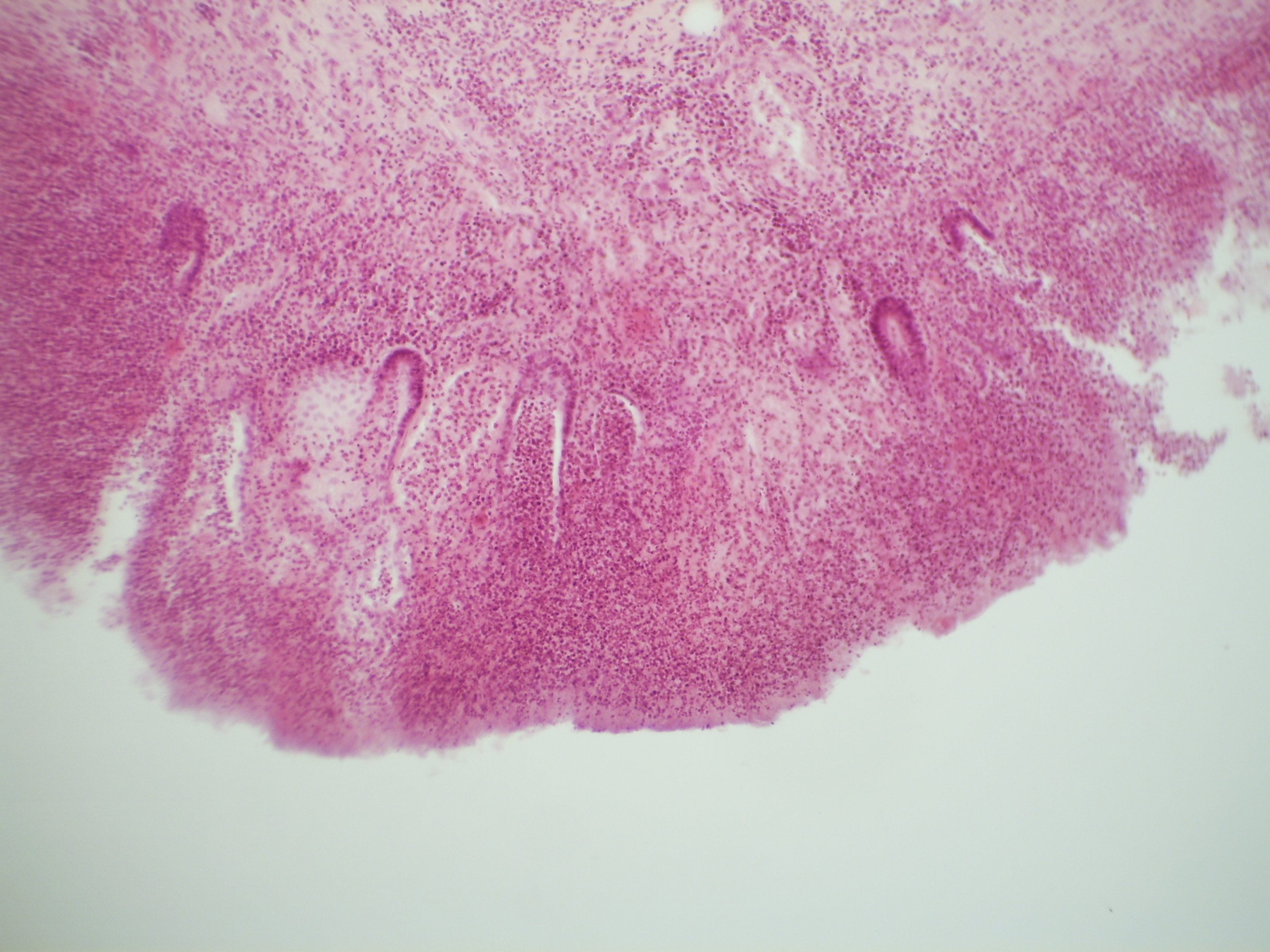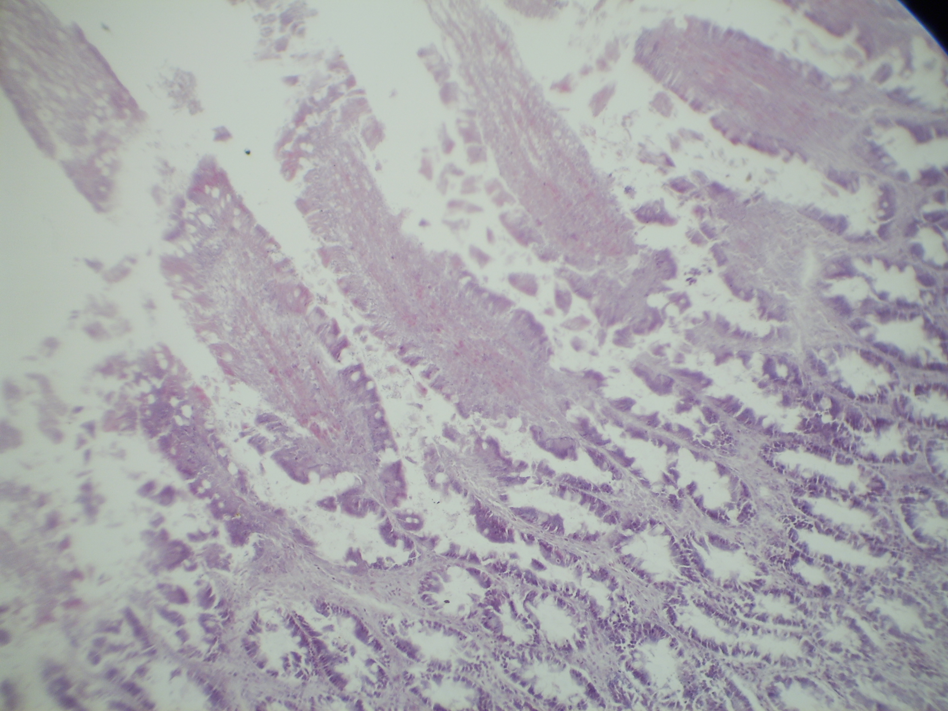 Микроскопическая картина острого катара кишечника характеризуется в той или иной степени выраженной гиперемией, серозным отеком ворсинок и толщи слизистой, непостоянными диапедезными кровоизлияниями и эмиграцией лейкоцитов. К этому позднее присоединяются слизистая дистрофия и слущивание эпителия. Иногда наблюдается также серозно-клеточная инфильтрация подслизистой. Одновременно наступают изменения и в лимфатических фолликулах стенки кишечника. Они выражаются или размножением ретикулярных клеток в зародышевых центрах, или некробиотическими процессами, заканчивающимися распадом ретикулярных и лимфоидных клеток. При малом увеличении устанавливают, что нормальная структура слизистой изменена: границы ее расширены, ворсинки сильно утолщены, деформированы (особенно на концах); эпителиальный покров их полностью или частично отсутствует, нет клеток и в верхних отделах многих крипт, вследствие чего очертания отдельных ворсинок плохо выражены, различают лишь их концы. В соединительнотканной основе ворсинок, а также в толще слизистой повышенное содержание клеток, сосуды расширены. Границы фолликулов выступают более или менее отчетливо, в ряде случаев фолликулы увеличены, с бледно окрашенным расширенным центром. На поверхности слизистой оболочки, особенно между ворсинками, иногда можно найти остатки экссудата. При большом увеличении видно, что экссудат содержит: 1) слущенные, распадающиеся клетки покровного эпителия (в зависимости от степени выраженности десквамации клеток они располагаются или поодиночке или группами, а иногда лежат целыми пластами в виде лент; 2) серозную жидкость с примесью слизи; 3) небольшое количество полиморфноядерных лейкоцитов, могут встречаться также единичные эритроциты. Уточняя при сильном увеличении детали картины поражения слизистой, можно отметить, что сохранившийся эпителиальный покров в состоянии слизистой дистрофии, определяемой по большому количеству бокаловидных и спавшихся (уменьшенных в объеме) клеток; заметна зернисто-жировая дистрофия части эпителия. Дистрофическим и некротическим изменениям подвергается также эпителий верхних отделов крипт; в глубине криптон сохранился или полностью без изменений, или с явлениями слабо выраженной дистрофии. В некоторых случаях отмечают пролиферативные процессы в сохранившемся эпителии крипт. Соединительнотканная основа ворсинок и вся толща слизистой инфильтрированы серозной жидкостью, а также полиморфноядерными лейкоцитами и лимфоцитами. Если происходит размножение ретикулярных клеток, в бледно окрашенных центрах лимфатических фолликулов находят большие клетки с ядрами крупнее, чем у лимфоцитов. В распадающихся ретикулярных и лимфоидных клетках чаще всего находят пикнотические ядра. При отеке подслизистой границы ее бывают расширенными, сосуды инъецированы, в окружности сосудов иногда кровоизлияния, а также небольшие скопления лимфоцитов и гистиоцитов. Макрокартина: слизистая набухшая, пятнисто или полосчято гиперемирована, иногда краснота носит скарлатиновый характер; наблюдают кровоизлияния (не всегда), отек. Слизистая покрыта тягучей, полужидкой слизью. Хорошо различаются набухшие, выступающие в просвет лимфатические фолликулы. В просвете кишечника тягучие тяжи слизи (при слизистом катаре) или содержимое ки
