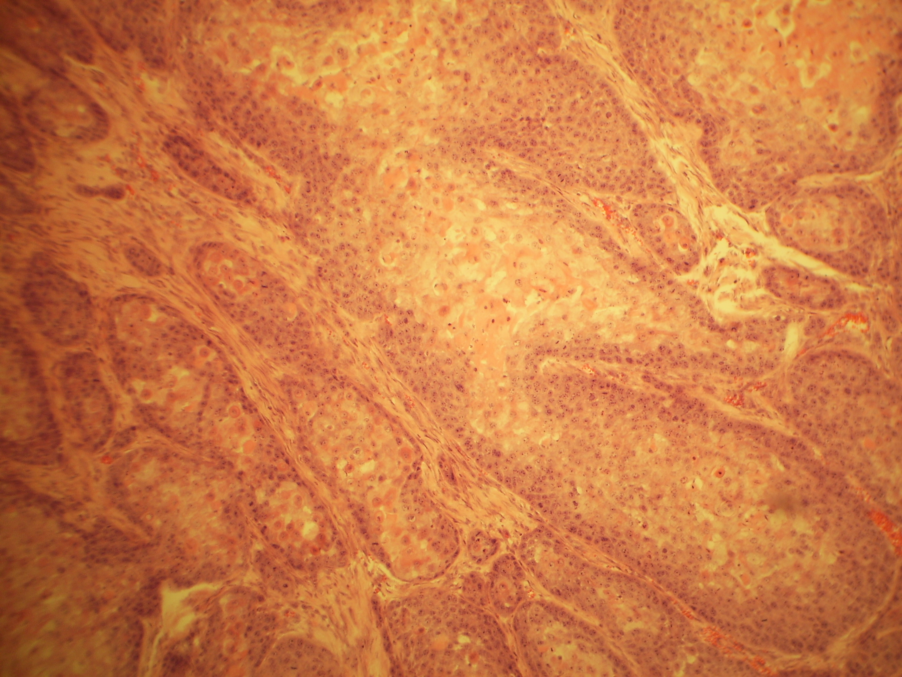 Название этого рака канкроид (только похожий, а не истинный рак) произошло из-за его медленного роста и редких случаев метастазирования. Происходит он из эпидермиса и по мере роста углубляется в кожу, подкожную клетчатку и даже в подлежащую скелетную мускулатуру. От корня канкроида во все стороны отходят корешки, а от последних еще более тонкие. В целом опухоль принимает вид корневища. Эпителий в ростках сохраняет способность дифференцироваться на роговой и мальпигиев слои. На гистологических срезах при малом увеличении микроскопа эпителиальная паренхима опухоли при гематоксилин-эозиновой окраске выступает в виде резко ограниченных участков, или гнезд, окрашенных в синеватый или сине-фиолетовый цвет. Соединительнотканная строма вместе с кровеносными сосудами разделяет эти гнезда широкими и узкими прослойками. Гнезда паренхимы, являющиеся косо, поперек и продольно перерезанными ростками, имеют различное очертание и величину; наиболее типичная форма их вытянуто-овальная, иногда с отходящими короткими отростками. Центры многих раковых гнезд содержат роговое вещество зернистого или слоистого строения, окрашивающееся эозином в темно-розовый цвет, а пикриновой кислотой в желтый. Слоистые роговые тела при макроскопическом исследовании поверхности разреза опухоли представляются в виде мелких серовато-белых матовых плотных зерен, похожих на жемчуг, что и послужило поводом назвать этот рак жемчужным. При большом увеличении микроскопа отдельные клеточные отростки паренхимы имеют сходство с эпидермисом кожи. Производящему слою здесь соответствуют клетки, расположенные на самой периферии эпителиального гнезда, а роговому слою – центр из роговых чешуек. Нередко можно проследить и переходные слои эпидермиса, соответствующие зернистому и светлому слоям. Гнезда без рогового вещества – это самые молодые корешки или те, срез через которые прошел сбоку от роговых чешуек. В отличие от эпителия кожи в раковых гнездах плохо выступает дифференцировка слоев, особенно переходных; Ороговевающие клетки очень долго сохраняют ядра, а рогового вещества образуется очень много (гиперкератоз). Последнее объясняется тем, что роговое вещество со всех сторон замкнуто клетками и не подвергается шелушению. Канкроид часто травмируется, поэтому в строме встречаются воспалительные очаги с резко выраженной гиперемией, кровоизлияниями и обильной инфильтрацией лейкоцитами. В процессе роста образуются узловато-бугристые плотные образования, от которых далеко в глубь ткани отходят отростки, поэтому резкая граница раковой опухоли с окружающей тканью отсутствует. Иногда канкроид растет в виде инфильтрата.