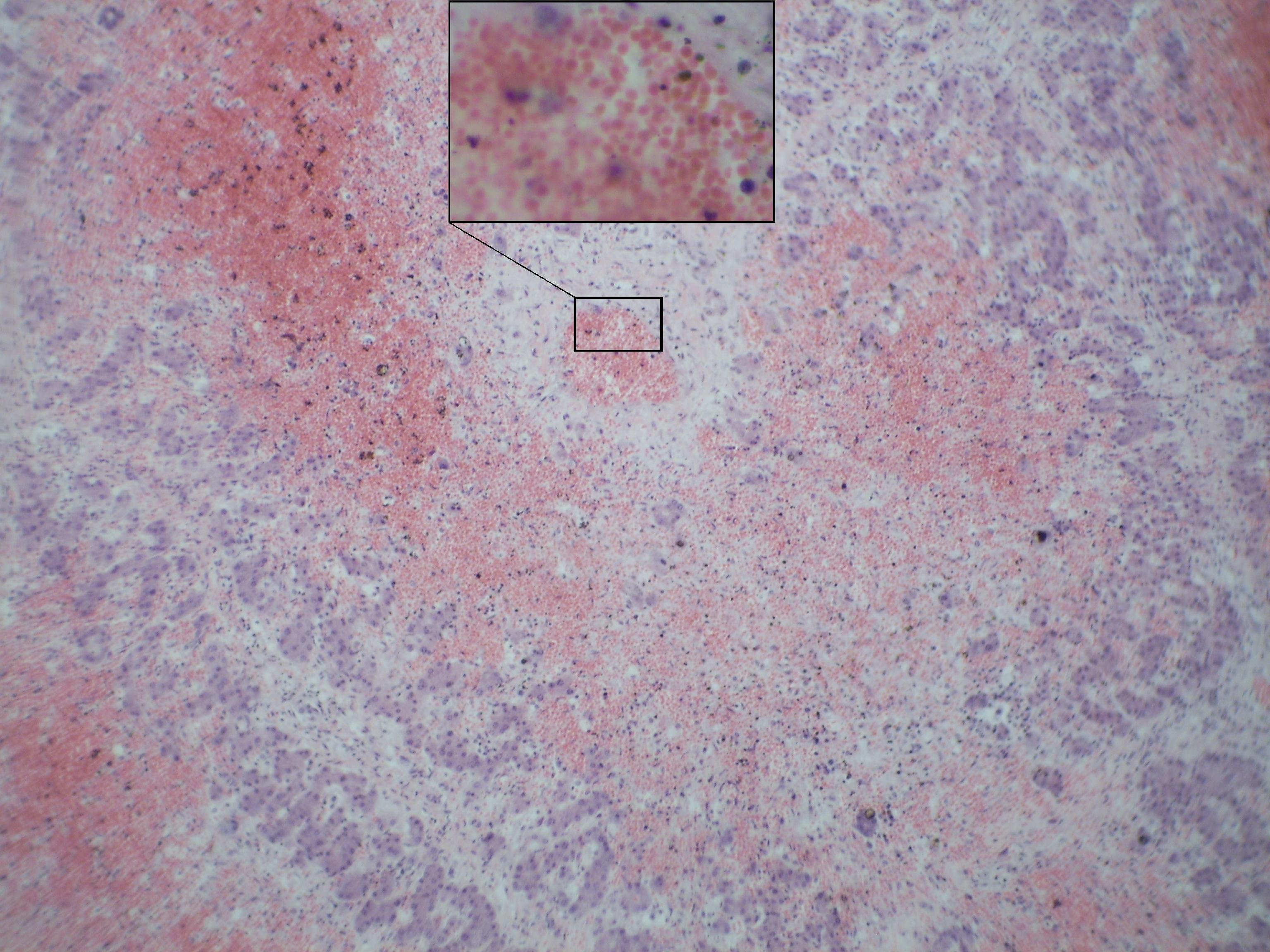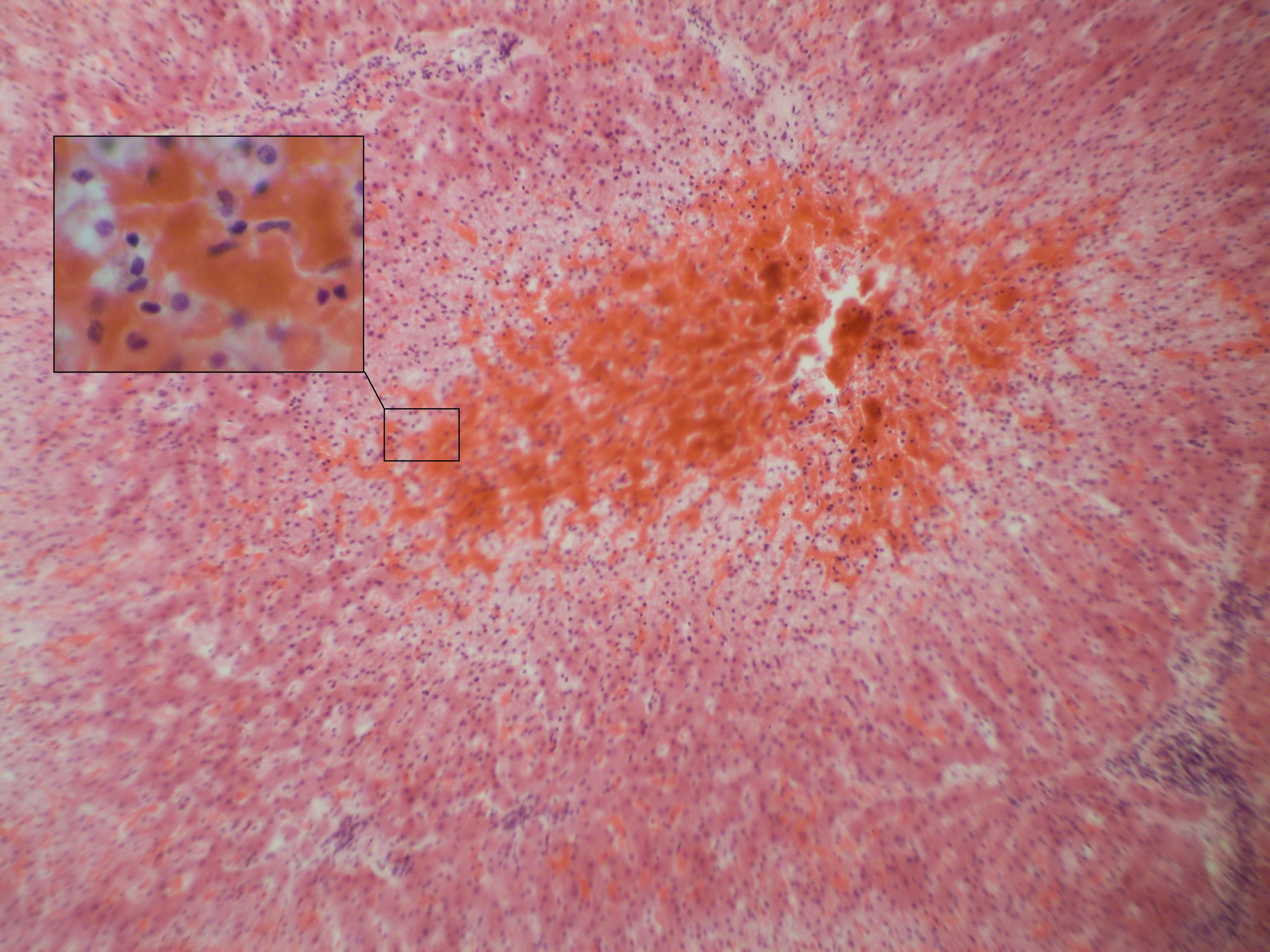Венозная гиперимия печени встречается довольно часто и бывает выражена сильнее, чем венозная гиперемия других органов брюшной полости. Происходит это потому, что всякие затруднения тока крови в задней полой вене в первую очередь отражаются на печеночной вене. Рассматривая препарат при малом увеличении микроскопа, необходимо в первую очередь обратить внимание на центральные части долек. Вследствие особенностей кровообращения в печени первые изменения наступают, как правило в районе центральных вен. Последние, а также впадающие в них внутридольковые капилляры сильно расширены и заполнены кровью (рис.36.). На периферии долек, ближе к междольковой соединительной ткани, гиперемия выражена слабо или отсутствует. Балки в центре долек более или менее истончены и раздвинуты друг от друга, а в отдельных дольках как бы распались на группы клеток. Создается впечатление, что эти группы клеток или даже отдельные печеночные клетки свободно располагаются среди скопищ эритроцитов. Такое впечатление усиливается еще тем, что при обычной гематоксилин-эозиновой окраске стенки сильно расширенных капилляров остаются незаметными. Затем переходят к изучению деталей препарата при большом увеличении микроскопа, обращая внимание на центральные и периферические части долек. Печеночные балки центров долек тонкие, местами разорваны. Границы печеночных клеток неотчетливы, а их ядра в основной массе уменьшены, темно красятся , и часть их имеет неровные, зубчатые контуры – состояние пикноза. В печеночных клетках иногда можно обнаружить желто-коричневые или бурые зернышки пигмента липофусцина, что объясняется длительным нарушением в них обмена веществ. Цитоплазма печеночных клеток средней и периферической части долек часто содержит неокрашенные ячейки. Последние соответствуют каплям жира, которые при обработке среза спиртом оказались растворенными. Среди ожиревших клеток часто встречаются перстневидные формы, сходные с клетками жировой ткани. Все тело таких клеток занято одной жировой каплей, а ядро оттеснено к его периферии. Макроскопически печень с поверхности и на разрезе пестрая, имеет рисунок мускатного ореха (мускатная печень). Обусловлено это тем, что центры долек вследствие скопления там крови окрашиваются в красный, буровато-красный или сине-красный, периферия – в бледно серый или серо-желтый (от жира) цвет. Объем печени несколько увеличен, капсула напряжена, с поверхности разреза стекает много темной – венозной крови.