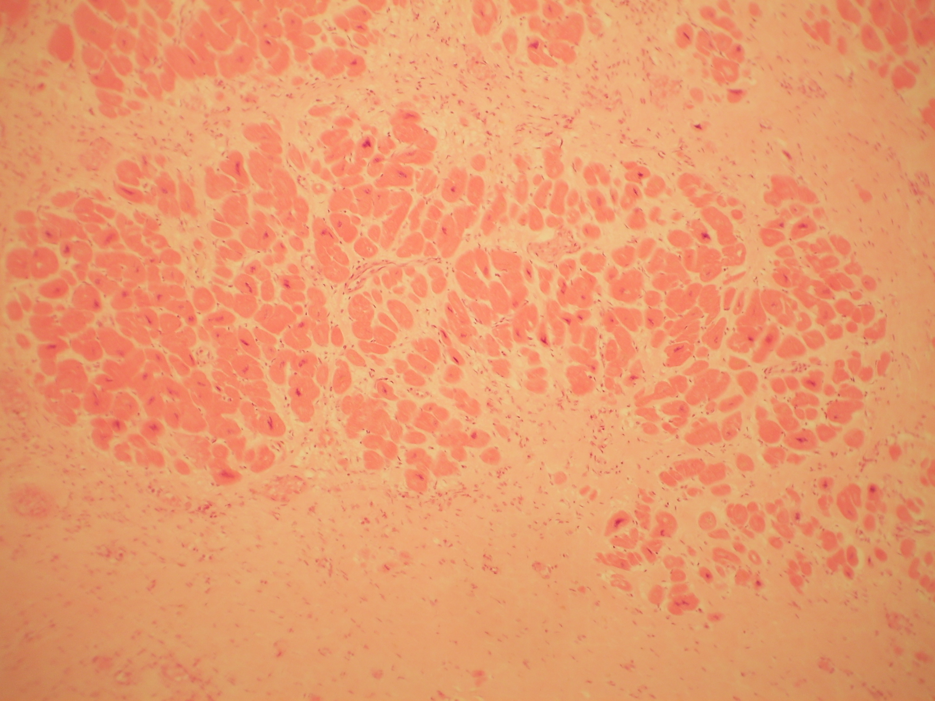 Гипертрофия сердечной мышцы развивается при повышении функциональной нагрузки сердца вследствие препятствий для нормального оттока крови, например при пороках клапанов, изменения аорты, нефритах, эмфиземе легких и т.п. Чаще всего гипертрофируется мышца левого желудочка, реже правого или обоих вместе. Иногда наблюдается общая гипертрофия сердечной мышцы всех отделов (при комбинированных пороках). Гипертрофированная мышца выравнивает нарушенное кровообращение, компенсирует развившийся порок (рабочая компенсаторная гипертрофия). Степень гипертрофии зависит от причины (места) и длительности процесса различна. Чтобы правильно оценить изменения мышечных волокон при гипертрофии, целесообразно (для сравнения) параллельно просматривать препарат нормальной мышцы . Исследуя препарат под малым увеличением, можно видеть, что общее строение (архитектоника) мышечной ткани не изменено. Однако обращает на себя внимание утолщение мышечных волокон и увеличение в объеме их ядер, имеющих округлую или неправильную форму и более бледную окраску гематоксилином по сравнению с нормальными. При большом увеличении отчетливо видно, что гипертрофированные мышечные волокна богаче саркоплазмой, миофибриллы утолщены и их больше, чем в нормальных волокнах. Это особенно хорошо заметно на поперечных срезах. Наряду с гипертрофией мышечных волокон наблюдается разрастание интерстициальной соединительной ткани. Макроскопически гипертрофированное сердце в большей или меньшей степени увеличено в объеме, тяжелее нормального, с упругими, плотными коричневато-красными утолщениями (в соответствующих отделах) стенками. На разрезе отчетливо виден рисунок мышцы. В полости гипертрофированного отдела резко выступают увеличенные в объеме папиллярные мышцы и утолщенные трабекулы.
