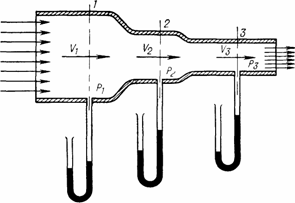 Рассмотрим трубу (Рис. 10) переменного диаметра (1, 2, 3), в которой движется воздушный поток. Для измерения давления в рассматриваемых сечениях используют манометры. Анализируя показания манометров, можно сделать заключение, что наименьшее динамическое давление показывает манометр сечения 3-3. Значит, при сужении трубы увеличивается скорость воздушного потока и давление падает.