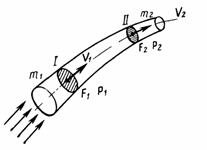 Секундный массовый расход воздуха m равен произведению секундного расхода воздуха на плотность р воздушного потока струйки. Согласно закону сохранения энергии, масса воздушного потока струйки m1, протекающего через сечение I (F1), равна массе т2 данного потока, протекающего через сечение II (F2), при условии, если воздушный поток установившийся: