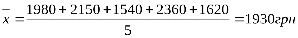 Наприклад, заробіток 5 робітників бригади за місяць був таким (грн.): 1980; 2150; 1540; 2360; 1620. Середня заробітна плата одного робітника складає: