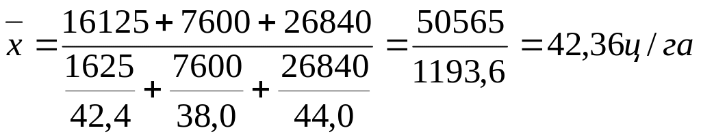 Саме посівна площа відіграє роль ваги. Цей показник відсутній, але його легко розрахувати, розділивши по кожній бригаді валовий збір на середню урожайність. В такому випадку середня урожайність складає: