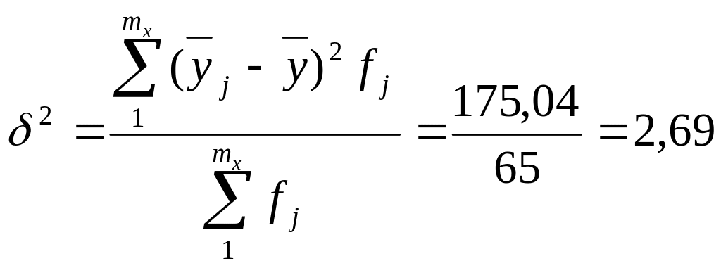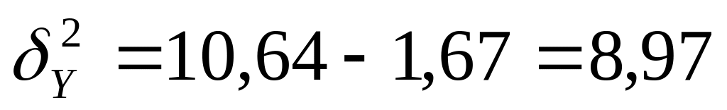 Застосуємо кореляційне відношення для оцінки щільності зв’язку між розміром МТК і продуктивністю праці (див. табл.6.3 та 6.4). Розрахунок загальної та факторної дисперсії показано нижче. Згідно з розрахунками загальна дисперсія становить 4,41, а факторна 2,69.