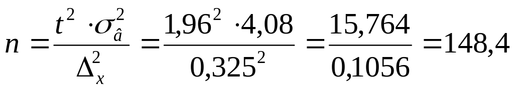 Для порівняння визначимо чисельність вибірки у випадку повторного випадкового відбору, який використовується при відсутності даних чисельності генеральної сукупності: