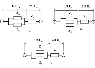 З еквівалентних схем видно, що при з’єднанні навантаження зіркою кожна фаза ввімкнена або паралельно іншій фазі і послідовно з третьою, або послідовно з двома іншими фазами, з’єднаними паралельно. Тому до кожної фази прикладається нпруга, яка дорівнює Ud/3 або 2Ud/3 (при рівних опорах фаз) і фазна напруга на навантаженні має двоступеневу форму.