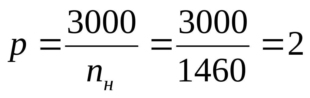 ni - частота вращения магнитного поля двигателя, которую определяем из зависимости ni = 60f1/p.=60·50/2=1500 об/мин. В индивидуальном задании приведено значение номинальной частоты вращения ротора двигателя nн, которая меньше n1 на величину скольжения SH=(2-6)%, т.е. nн=n1(1 – SH).