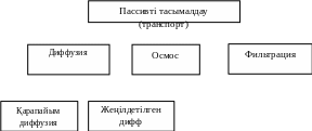 Пассивті тасымалдау және оның түрлері: диффузия, жеңілдетілген диффузия, осмос және фильтрация.