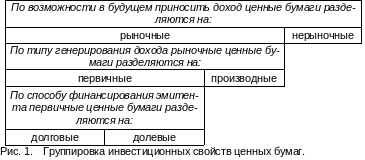 Из сказанного выше следует, что возможность в будущем приносить держателю доход (рис. 1), является важнейшим (однако не единственным) инвестиционным свойством (иначе говоря, качеством) ценных бумаг. В соответствии с обозначенным свойством (еще раз отметим, что это возможность получения дохода) ценные бумаги можно условно разделить на рыночные и нерыночные. Рыночные ценные бумаги продаются и покупаются, поскольку способны, как уже было отмечено, приносить доход, а желающие получить этот доход обычно всегда находятся. Укажем, что ипотечный сертификат участия, государственная облигация, облигация, облигация с залоговым обеспечением, биржевая облигация, простой вексель, переводной вексель, депозитный сертификат, сберегательный сертификат, привилегированная акция, обыкновенная акция, опцион эмитента, форвардный контракт, фьючерсный контракт, депозитарная расписка и приватизационные ценные бумаги относятся к числу рыночных ценных бумаг. Нерыночные ценные бумаги не предусматривают получение дохода, поэтому вряд ли найдутся желающие их купить. Укажем, что закладная, чек, дорожный чек, коносамент, простое складское свидетельство, двойное складское свидетельство, складское свидетельство, залоговое свидетельство (варрант) и банковская сберегательная книжка на предъявителя относятся к числу нерыночных ценных бумаг. Подчеркнем, что в обычных условиях1 они не являются объектом купли-продажи, а лишь закрепляют право собственности держателя на оговоренный имущественный объект либо подтверждают (уместно даже сказать, гарантируют) право кредитора, которым является держатель, требовать от заемщика погашения оговоренного обязательства.