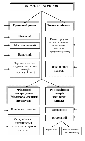 2) ринку цінних паперів, який належить до «каналів» прямого фінансування і у свою чергу, поділяється на первинний ринок (нові емісії цінних паперів) і вторинний (де відбувається купівля-продаж раніше випущених цінних паперів), який, в свою чергу, поділяється на біржовий (фондові біржі) і позабіржовий («вуличний») ринки цінних паперів.