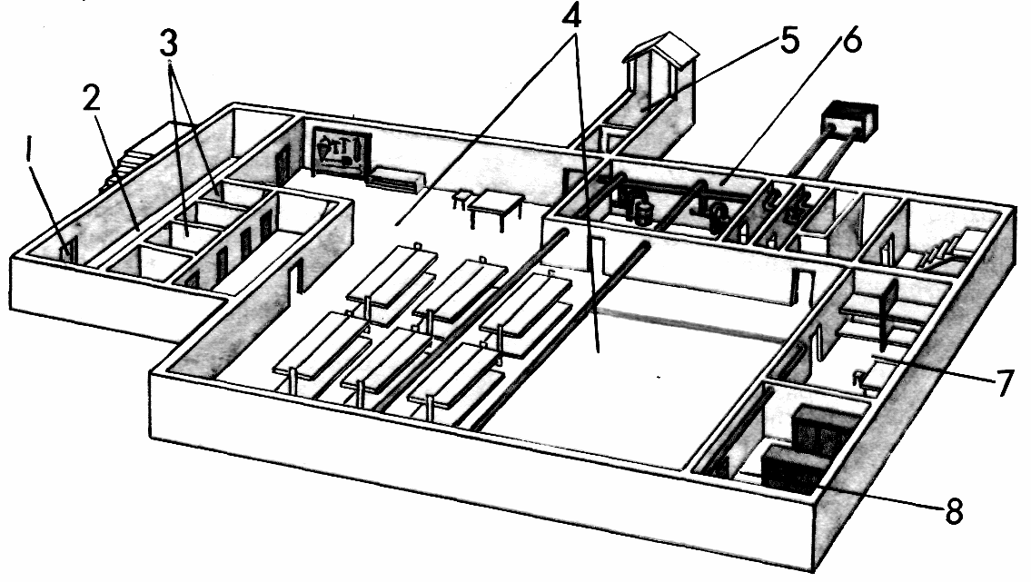 1 - захисно-герметичні двері; 2 - шлюзові камери; 3 - санітарний вузол; 4 - основне приміщення для розміщення людей; 5 - галерея і оголовок аварійного виходу; 6 - фільтровентиляційна камера; 7 - медична кімната; 8 - комора для продуктів.