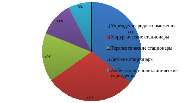 По данным из форм федеральной статистической отчетности, наибольшее количество случаев ВБИ зарегистрировано в учреждениях родовспоможения (35,6%) и хирургических стационарах (29,4%). На долю терапевтических и детских стационаров, амбулаторно-поликлинических учреждений пришлось 15,9%, 11,2% и 7,6%.