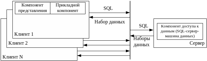 Прикладной компонент системы (библиотеки запросов, процедуры обработки данных) полностью размещается и выполняется на клиентской установке. При реализации своих функций прикладной компонент формирует необходимые SQL-инструкции, направляемые SQL-серверу. SQL-сервер, представляющий специальный программный компонент, ориентированный на интерпретацию SQL-инструкций и высокоскоростное выполнение низкоуровневых операций с данными, принимает и координирует SQL-инструкции от различных клиентов, выполняет их, проверяет и обеспечивает выполнение ограничений целостности данных и направляет клиентам результаты обработки SQL-инструкций, представляющие, как известно, наборы (таблицы) данных.