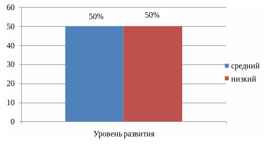 1. По количеству запомнившихся слов после пятого воспроизведения 5 детей имеют средний уровень, что составляет 50% и 5 детей имеют низкий уровень запоминания, что составляет 50%. Наглядно представим результаты на рисунке 1.
