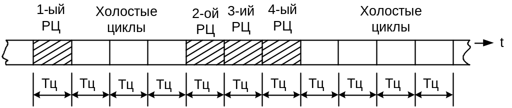 Сложные рабочие циклы (РЦ) передачи одинаковы по длительности и располагаются по оси времени непосредственно друг за другом или определяются временными интервалами, пропорциональными длине цикла работы распределителя.