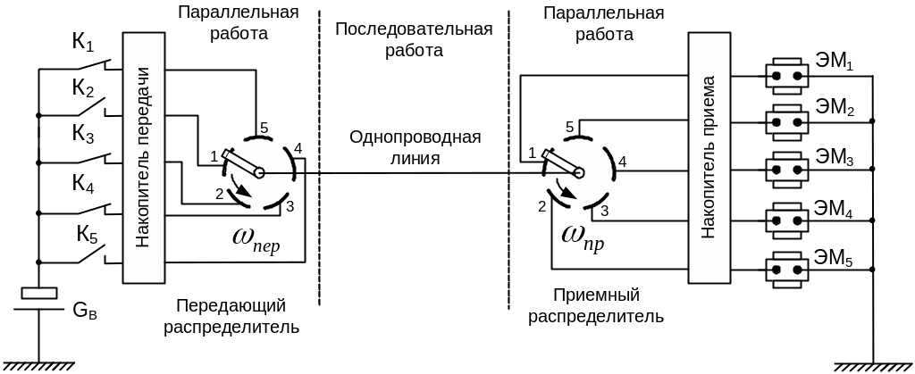 Количество элементов (контактов) распределителя может быть произвольным и достаточно большим. За один цикл (период) работы распределителя можно передать несколько кодовых комбинаций (многократные распределители).