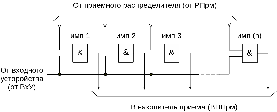 Устройство регистрации включают в себя набор схем совпадения по количеству импульсов в регистрируемой кодовой комбинации. На один из входов каждой схемы И поступает строб-импульс, поочередно подаваемый от приемного распределителя с периодом Tрег = t0. Вторые входы всех схем И запараллелены и подключены к выходу входного устройства (ВхУ). На эту шину поступают регистрируемые импульсы.