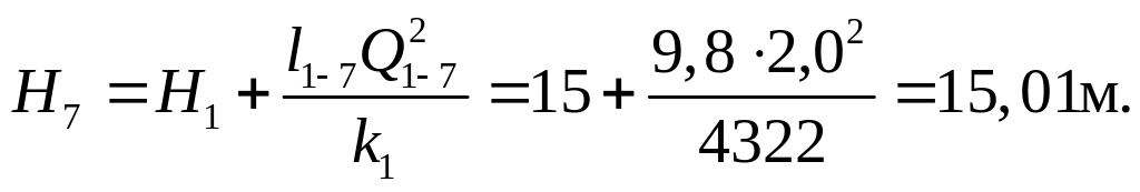 При минимальном напоре у генератора №1 равном 15 м. расход из него составит 5,72 л/с. Принимаем расход на участке 1-7 равный 2,0 л/с и по направлению 1-2 расход 3,72 л/с.