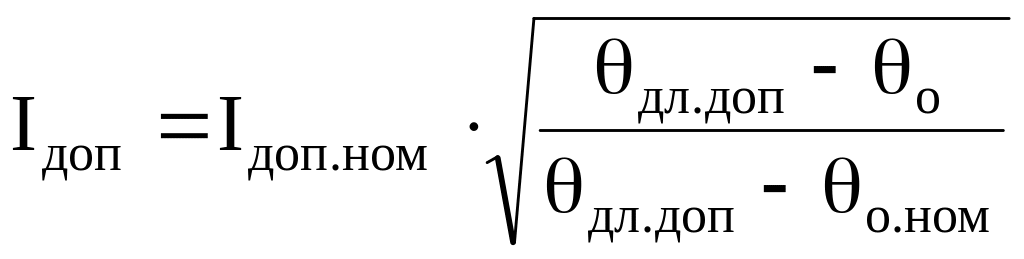где о.ном= 25С – нормируемая температура охлаждающей среды, при которой определяется номинальный допустимый ток проводника; Iдоп.ном – номинальный допустимый ток проводника; дл.доп – длительно допустимая температура проводника (для неизолированных проводов и окрашенных шин дл.доп=70С); о – действительная температура охлаждающей среды.