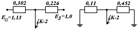 Сеть 220 кВ имеет большие токи замыкания на землю. Условия отключения однофазного к.з. здесь могут быть столь же тяжелыми, что и трехфазного и потому следует рассчитывать токи к.з. и параметры восстанавливающегося напряжения в обоих случаях. На рис. 6.3 представлены свернутые к точке К-2 схемы замещения всей системы для токов прямого (а) и нулевого (б) следования фаз.