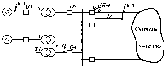 S=10000 МВА; хс(1)=4,84 Ом; хс(0)=2·хс(1)=9,68 Ом; х(1), х(0) – сопротивления в расчетных схемах прямой и обратной последовательности.