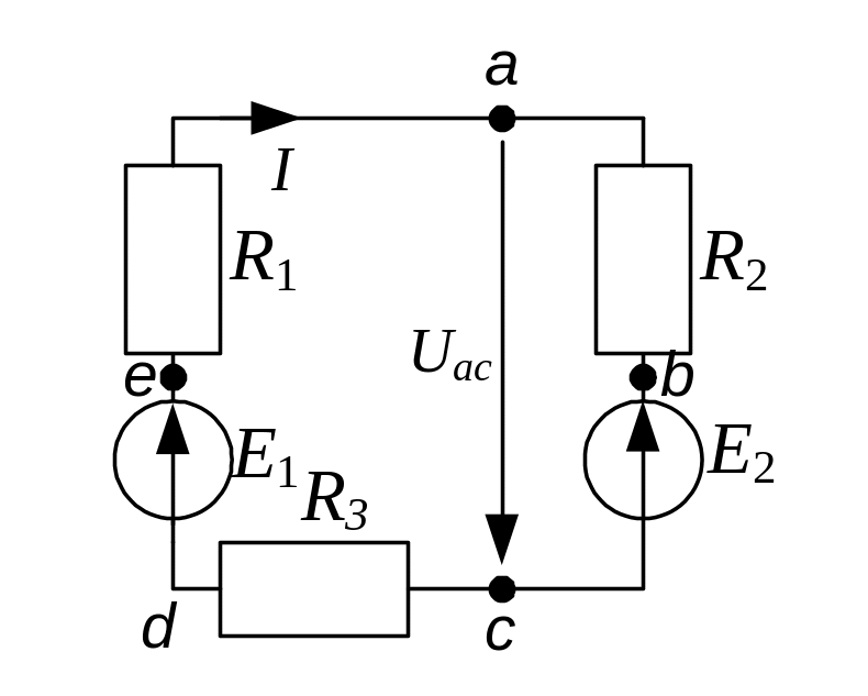 Напряжение Uac определим из уравнения, составленного по второму закону Кирхгофа для контура acdea: Uac + I(R1 + R3) = E1 , откуда