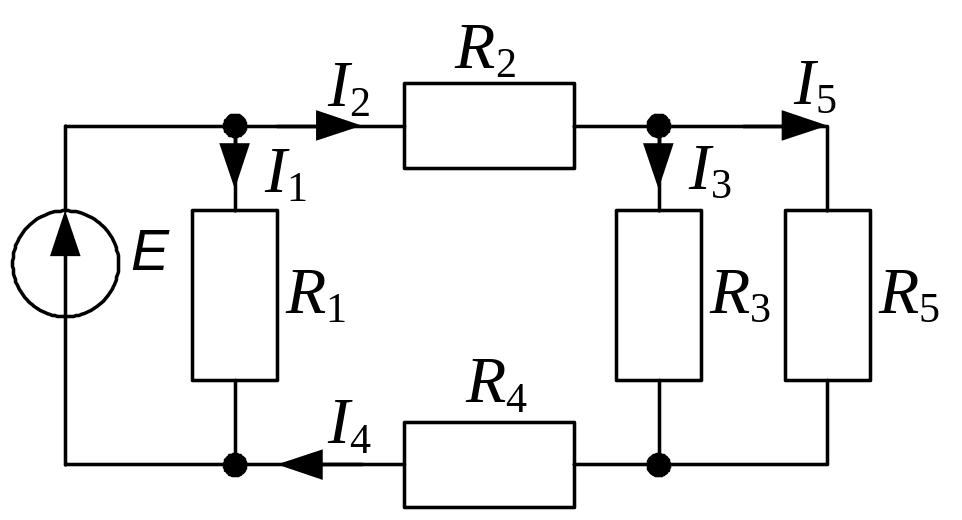 Определить величину ЭДС E и сопротивление R5 в цепи (рисунок 1.74), если I2 = 4 A; I5 = 2 A; R1 = 15 Ом; R2 = 8 Ом; R3 = 6 Ом; R4 = 4 Ом.