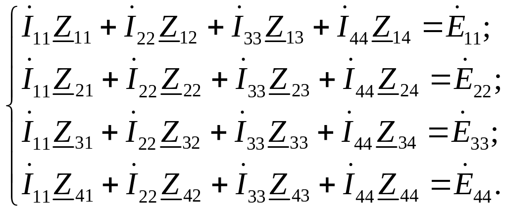 Если бы в схеме было больше двух контуров, например четыре, то система уравнений состояла бы из четырех уравнений: