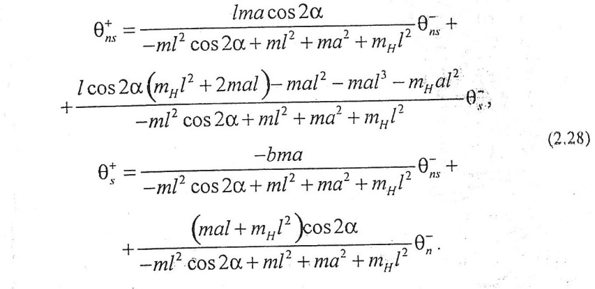 Ө+ns= Өns (0), Ө+s= Өn (0) симметриялық жүріс үшін.Симметриялық жүріс соңғы қадамда балық параметрлер бастапқы қалпына келетінің көрсетеді. t=Т деп қабылдап және бастапқы бұрыштарды α және Φ орынына Өs, Өns , біз сәйкесінше -α-φ және α-φ коя аламыз. Өs, Өns орынына -s, -ns аламыз.Осыдан кейін алынған теңдікті аяқты ауыстыру үшін арналған жылдамдық теңдеуіне қоямыз,бұрыштық(углов) формуламен қоса төрт белгісіздікпен төрт теңдік аламыз. Оларды жүйенің белгілі инерциондық және геометриялық параметрлерде, сонымен катар жазықтықтын бұрыштық еңкейуімен шешіп, екі аяқты жүрісті үлгілеу (моделирование) үшін ізделіп отырған параметрлерді аламыз.