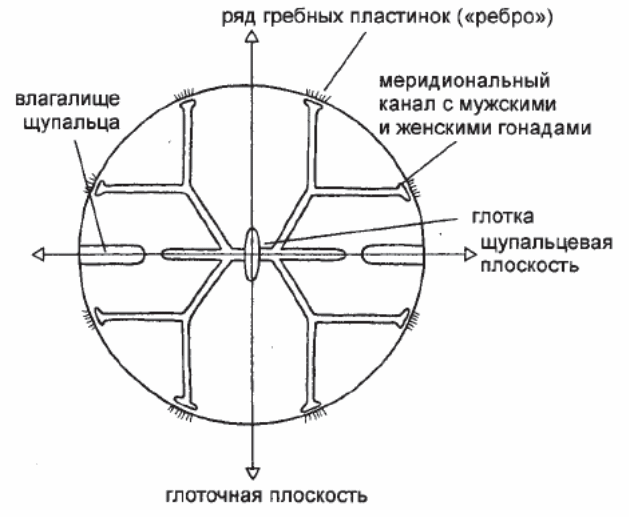 Мезогастр. Представляет собой 4 канала, отходящие от желудка в поперечной плоскости, которые потом ветвятся еще на 2 канала каждый. Эти каналы называются радиальными. Радиальные каналы оканчиваются меридиальными каналами, которые имеют продольную ориентацию. Меридиальные каналы залегают под гребными рядами и обеспечивают их всеми необходимыми веществами.