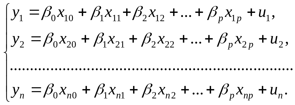 Узагальнена багатофакторна регресійна лінійна модель має вигляд: y = β0 + β1x1 +...+βрхр+ u, де y- результативна змінна; х1, х2, ..., хр - факторні змінні; u – стохастична складова, яка вводиться до моделі з метою урахувати наявність впливу факторів, які не входять до моделі, β0 , β1 ,..., βр –параметри моделі, а вибіркова регресійна модель - = b0 + b1x1+...+bрхр, де b0, b1,..., bр – оцінки параметрів моделі.