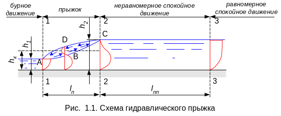 В пределах прыжка имеет место следующий характер движения. Линия АВС является поверхностью раздела между транзитной струей и вальцом АВСД. Ниже поверхности раздела, поток резко расширяется от глубины до . Выше этой поверхности – поверхностный валец (водоворотная область). Внизу вальца осредненные скорости направлены вдоль транзитной струи, вверху – в противоположную сторону.