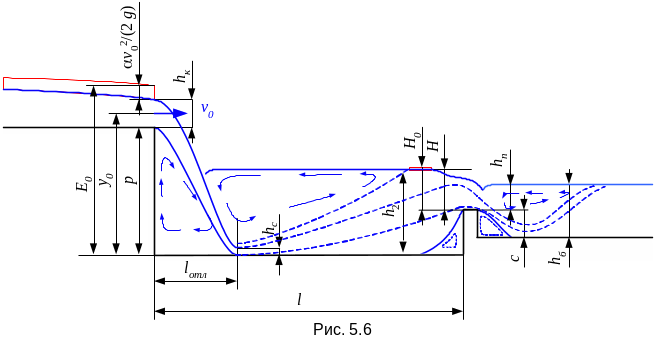 Водобойные стенки (рис. 5.5). Затопление прыжка в данном случае происходит за счет создания подпора перед водосливной стенкой высотой c.