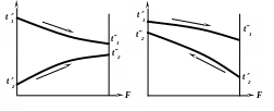 Рис. 6. Графіки зміни температур теплоносіїв вздовж поверхні теплообміну при прям отоці (зліва) і при протитоці (справа)