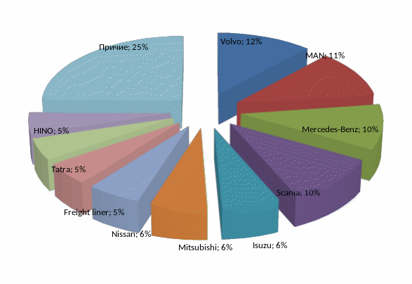 Российский парк грузовых автомобилей почти на 90% состоит из отечественной техники. Остальные 10% занимают иностранные грузовики, из них 62,8% - это европейские марки. На втором месте (16,1%) – грузовые автомобили японских брендов, на третьем (9,2%) - корейские. Далее идут грузовые автомобили американских (7,2%) и китайских (4,7%) брендов [7].